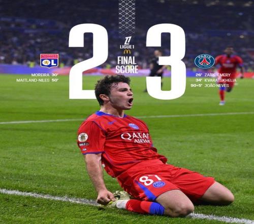 11月10日03:45,法甲联赛第12轮,里昂主场迎战巴黎圣日耳曼。上半场,埃梅里、克瓦拉茨赫利亚破门,维蒂尼亚两次助攻,莫雷拉、奈尔斯帮助里昂两次扳平。易边再战,李刚仁远射造险,塔利亚菲科两黄被罚下,内维斯补时绝杀。最终里昂2-3巴黎。积分榜方面,巴黎27分第一,里昂20分第七。